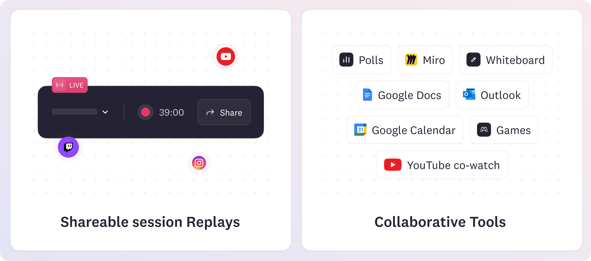 - Embedded document collaboration (Google Docs, Figma, Miro)