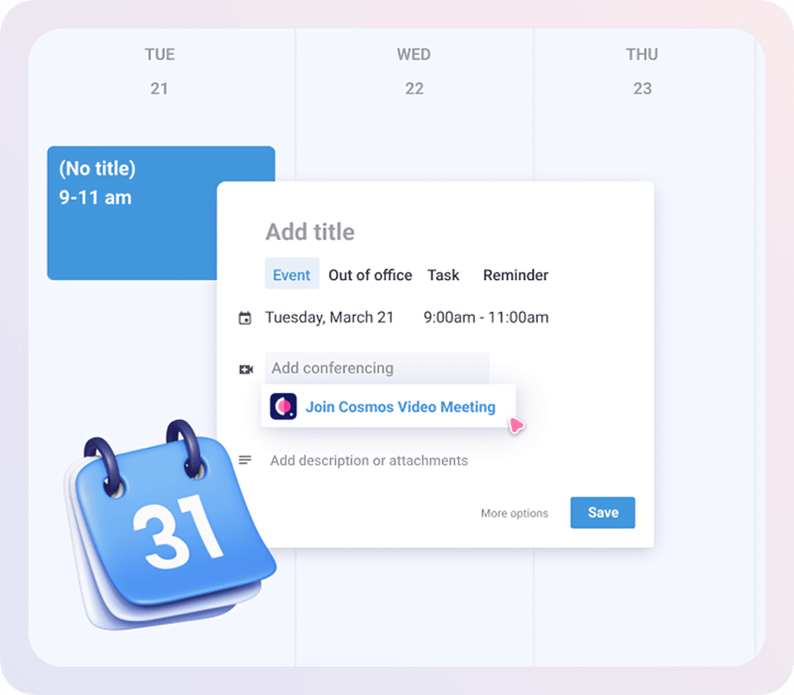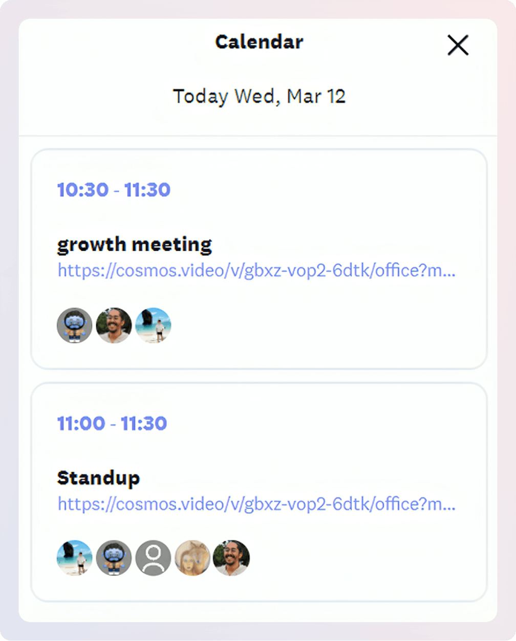 - One-click multi-person invites within Cosmos—no link sharing or platform switching unlike other virtual meeting platforms
