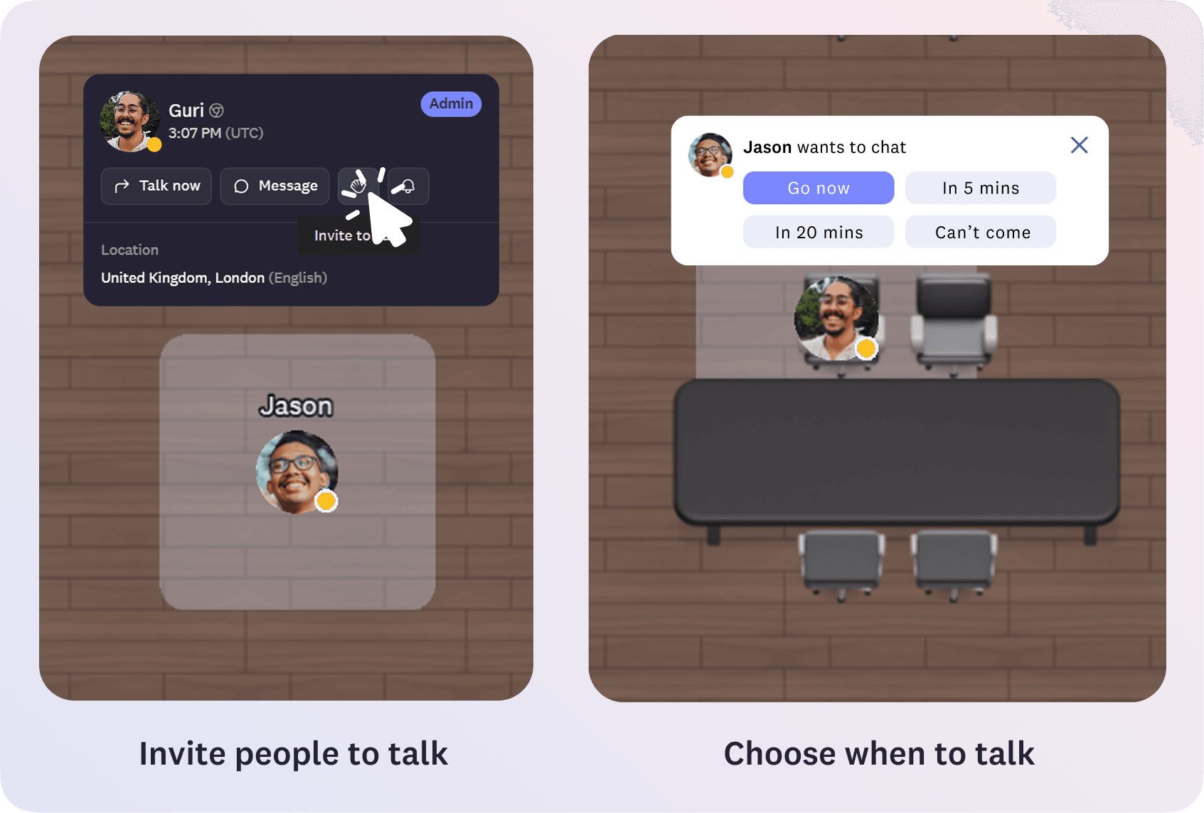 - Recreates office chit chat and builds remote culture – Brings back the natural flow of walking up to a colleague's desk, creating opportunities for spontaneous interactions that build relationships and team bonding