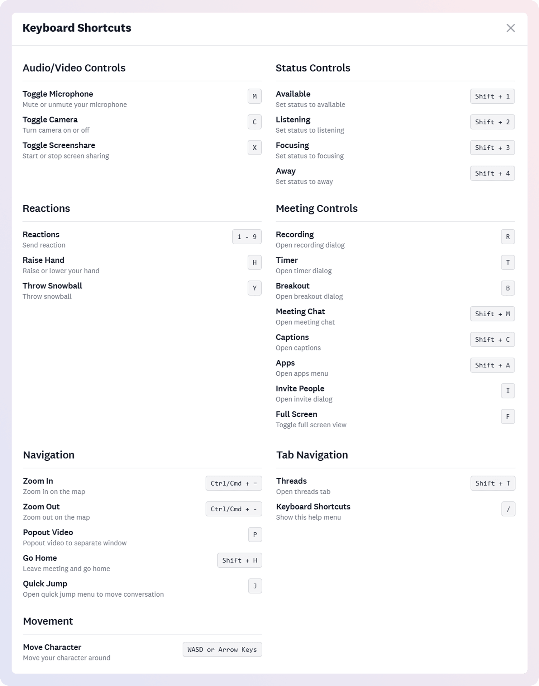 - Navigate between rooms, invite people to calls, and send messages—all from your keyboard
