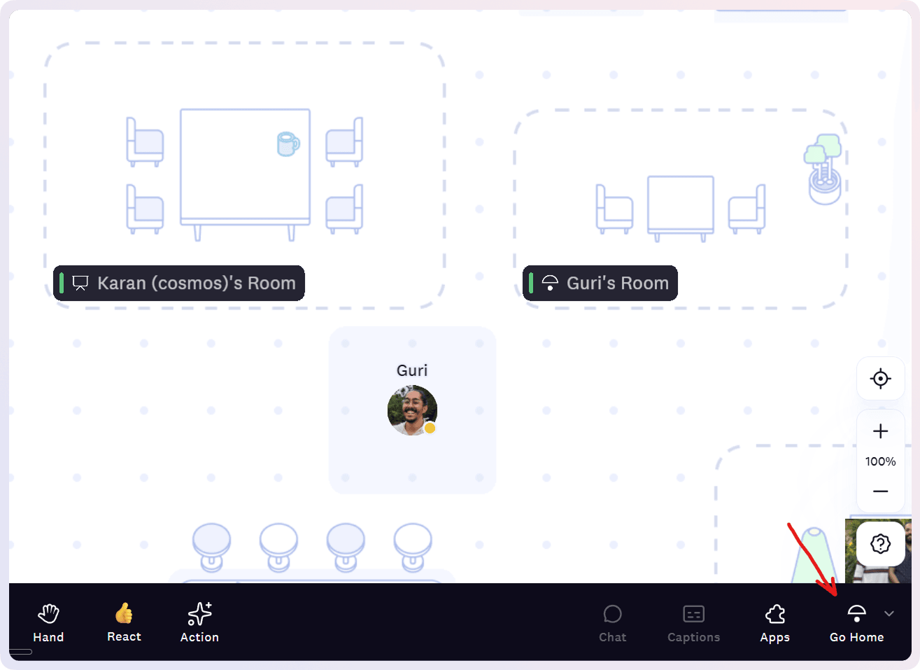 Return to your home desk instantly from anywhere in the space rather than searching for where you were working. Click Go Home in the bottom toolbar or use the keyboard shortcut (Cmd/Ctrl + H) to jump to your personal room in one click. This saves time and reduces cognitive load—you always know how to get "home."