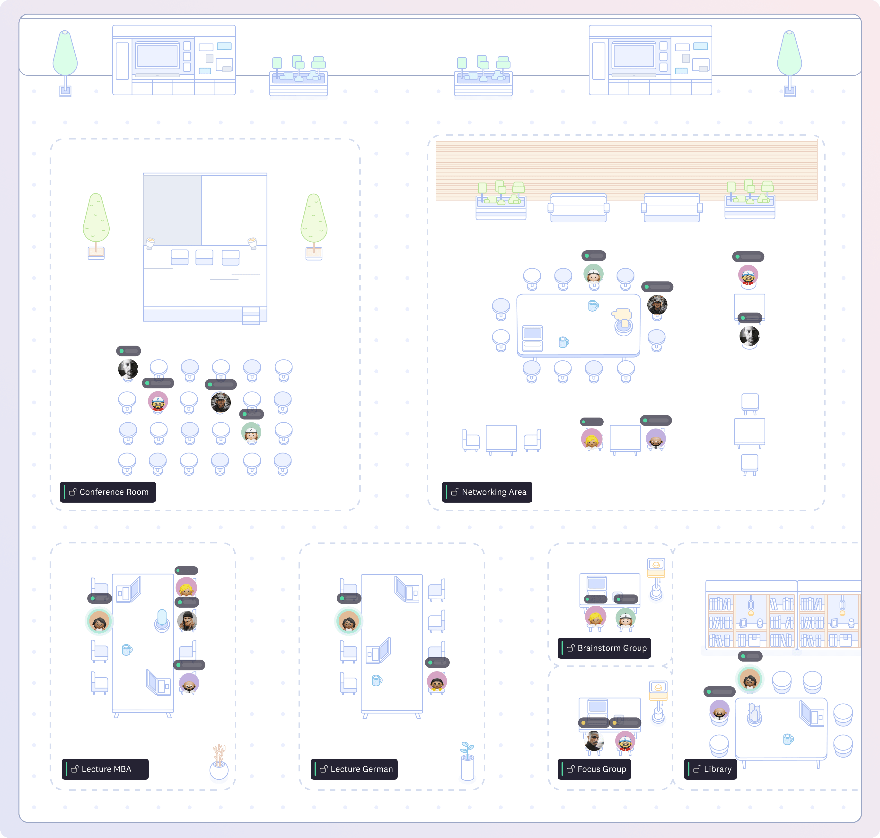 - Spatial areas for networking where participants connect and move freely
