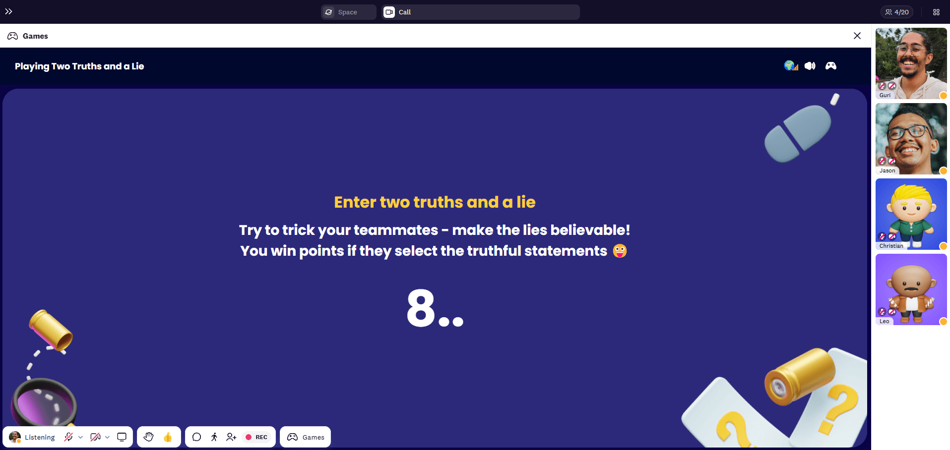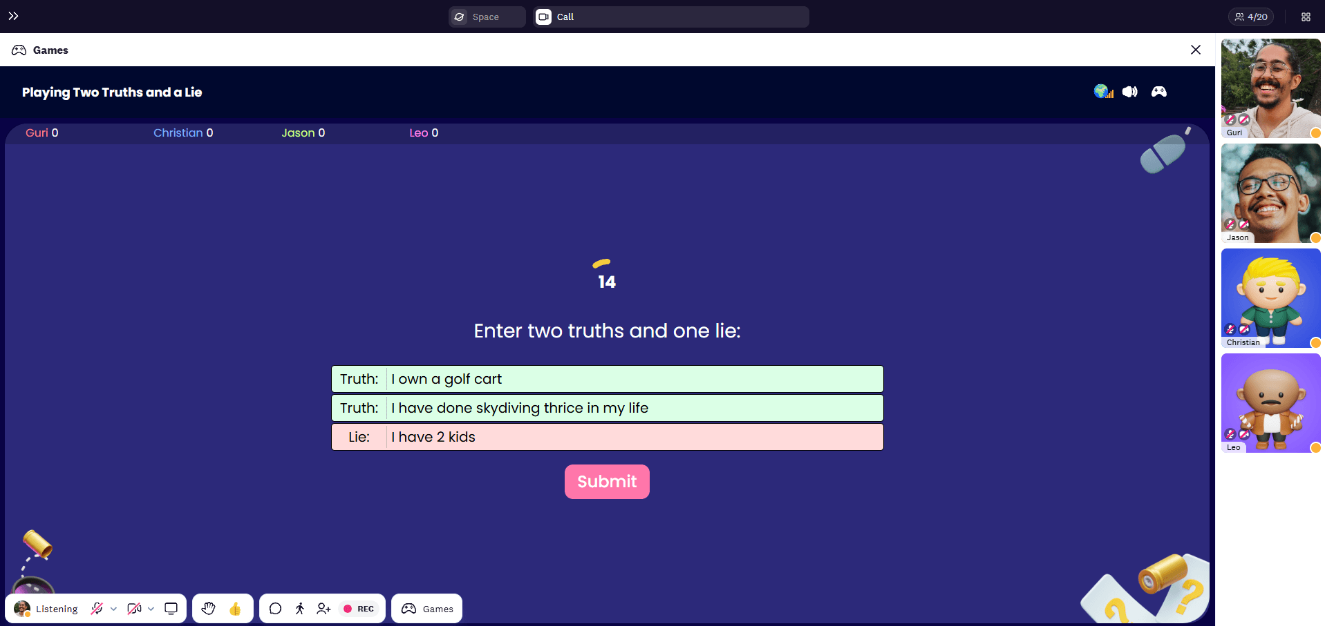2. Everyone else will vote on what they think is a lie. Once everyone has voted, the results will be shown, and points will be given. The game continues until everyone has shared their truths and lies.