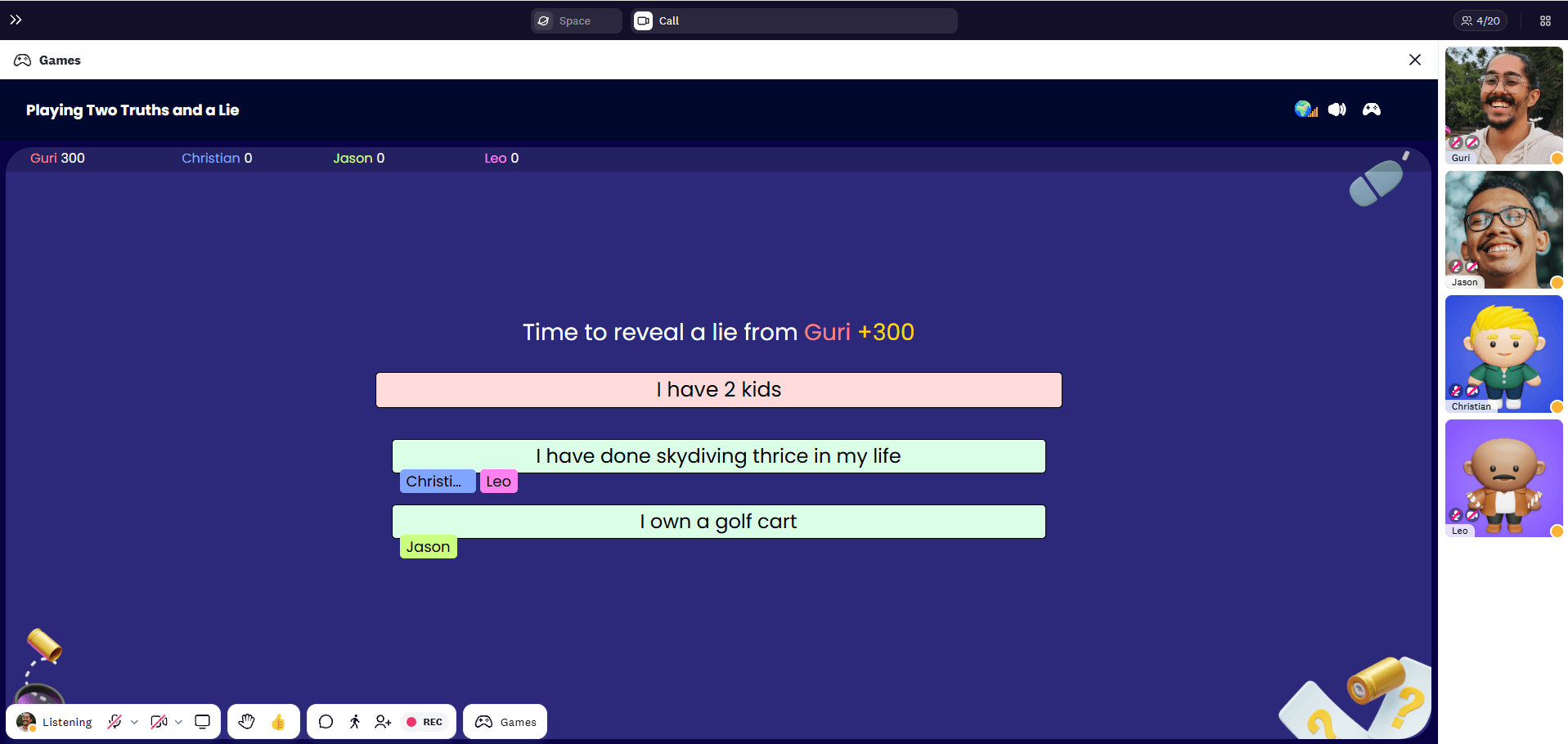 Once you are done, everyone will guess which statement they think you made up. After everyone makes their guesses, it will reveal which statement was your lie. The person who guesses the most truths wins the game.