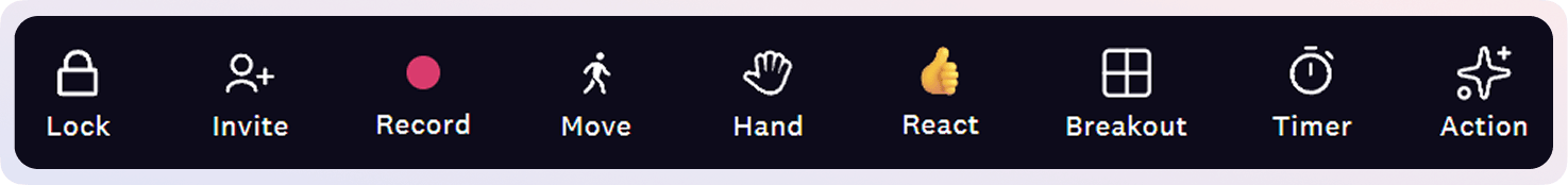 Built-in toolkit: Lock for privacy, Invite for bringing others in, Record for AI transcriptions, Hand Raise and React for engagement, Breakout for splitting into groups, Timer for tracking activities, and Apps for launching collaborative tools. Everything in one platform, no external links required.