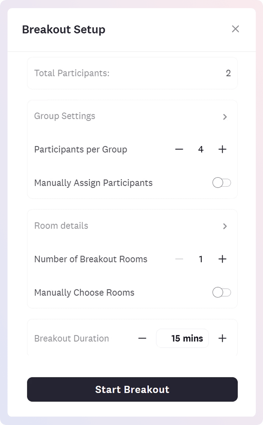 - Breakouts without coordination nightmare - Define group size and duration and participants are automatically distributed. No participants stuck in limbo, no manual invitation lists, no "can everyone see the breakout rooms?" confusion. Two clicks vs 15 minutes of setup. Real workshops and training sessions where breakouts actually work. Learn how to use them here.