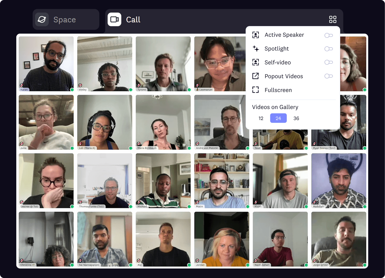 - Multiple view modes: space view (see spatial office), gallery view, pinned videos