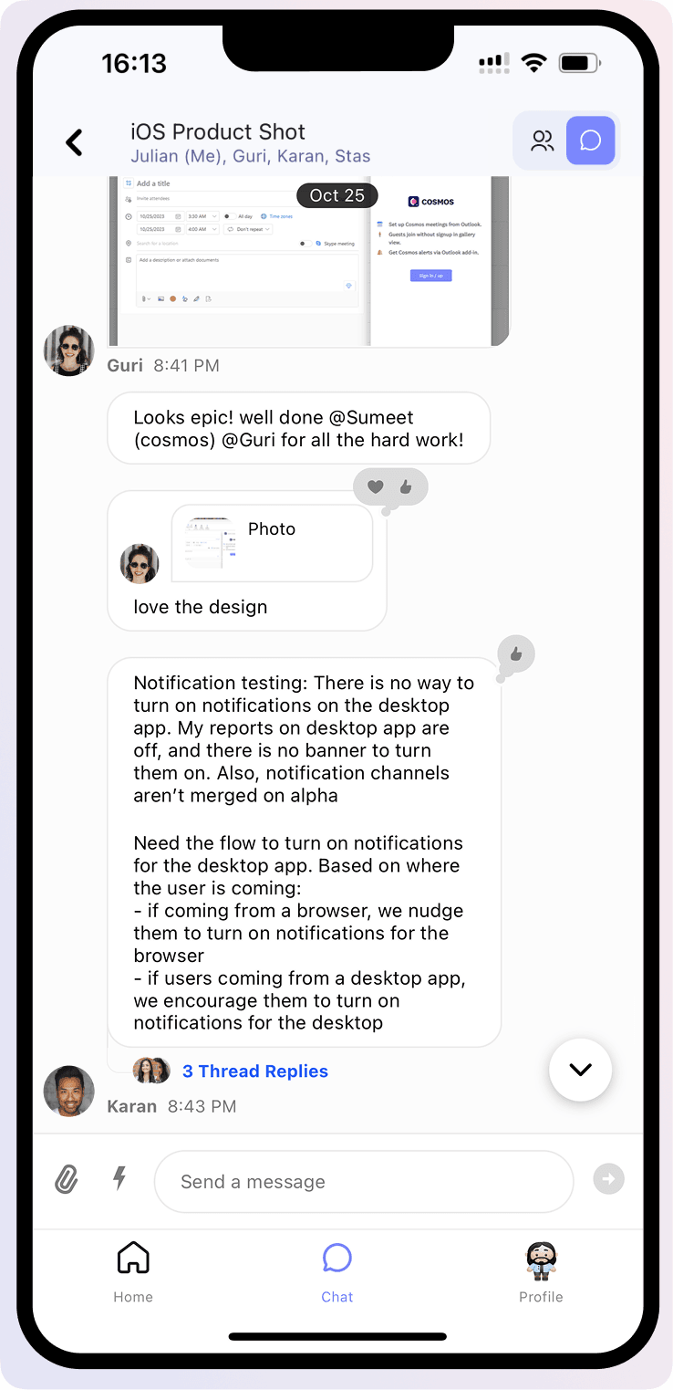 - Receive real-time notifications for space activity and when someone wants to connect with you