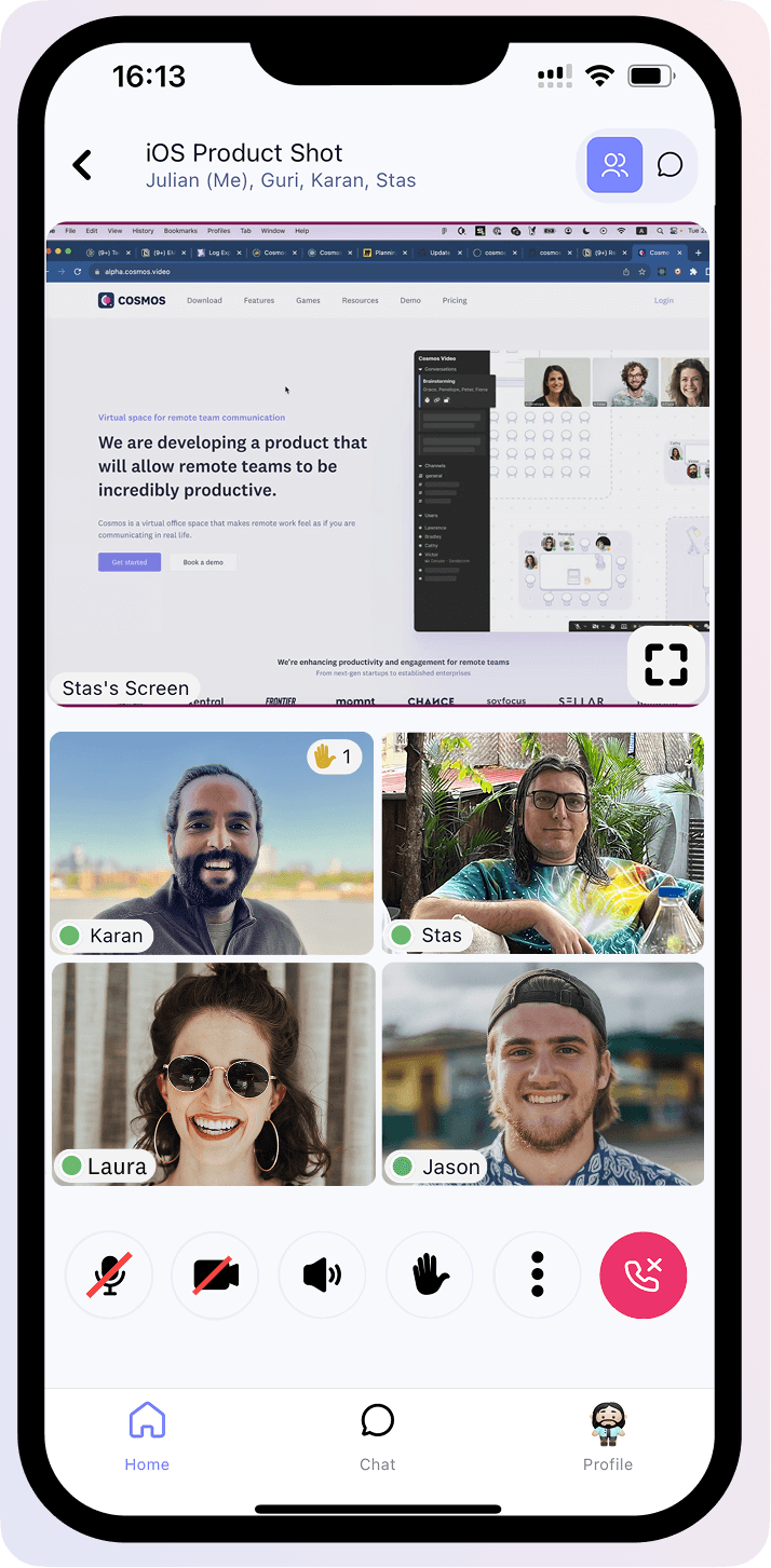 - View and maximize screen shares, pin speakers, and enjoy clear audio with background noise suppression