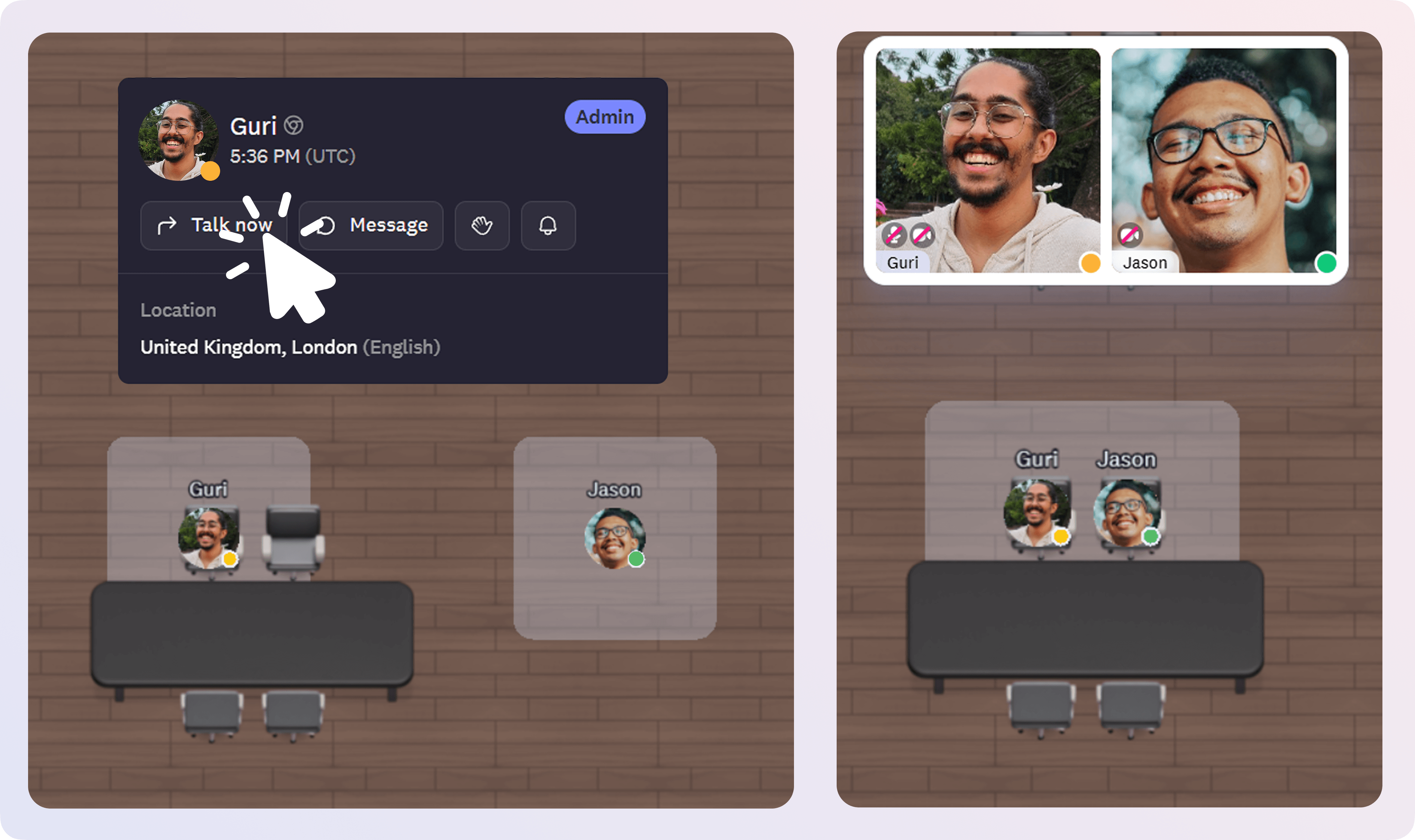 When you're at your personal room with access set to Open, teammates can start conversations instantly by walking up to your desk or clicking your room on the floor plan. Calls start automatically—no link sharing, no platform switching, no scheduling friction.