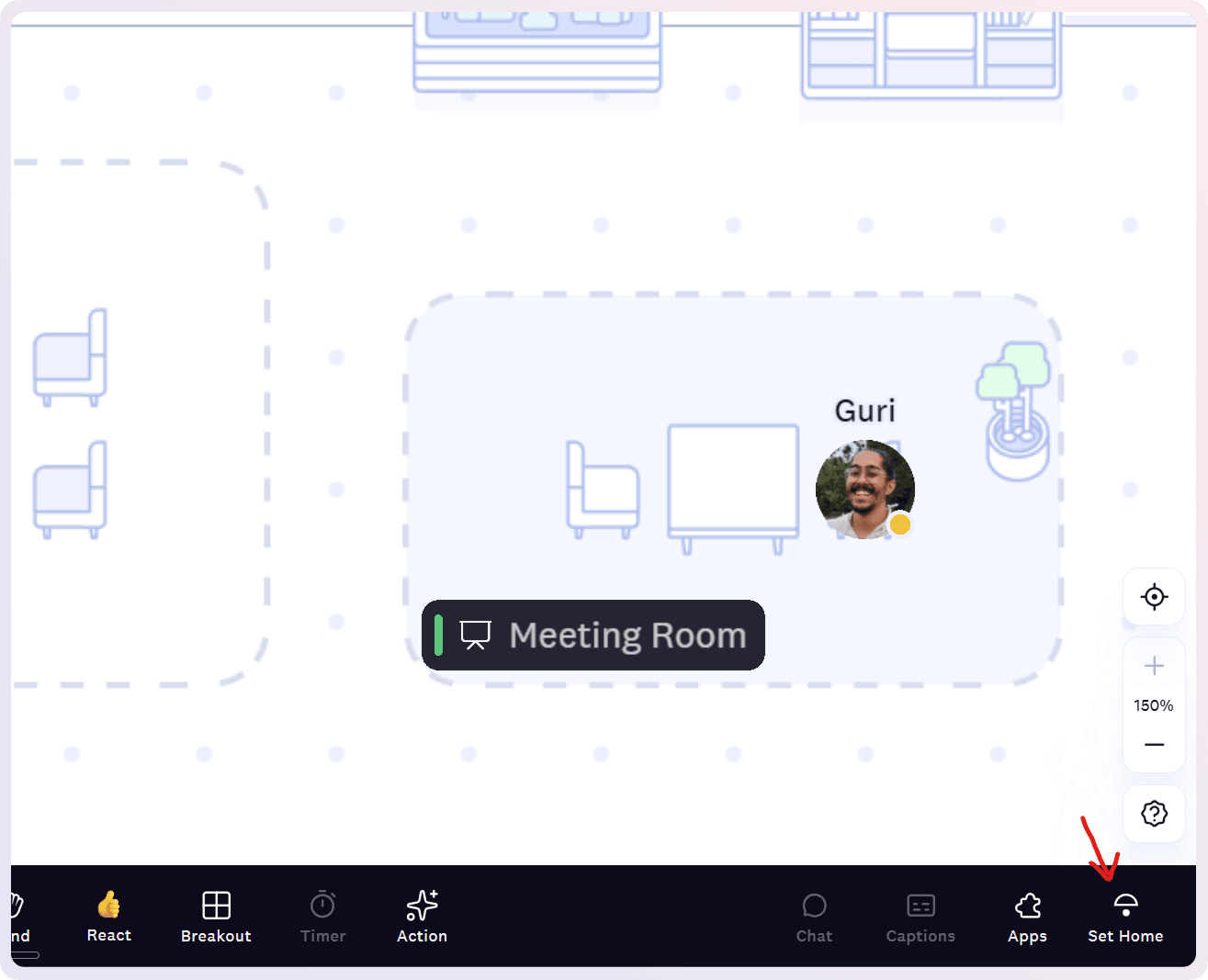 Navigate to any meeting room and click Set Home in the bottom toolbar. The room name automatically changes to "[Your Name]'s Room" for everyone in your space, and you'll spawn there every time you join Cosmos.