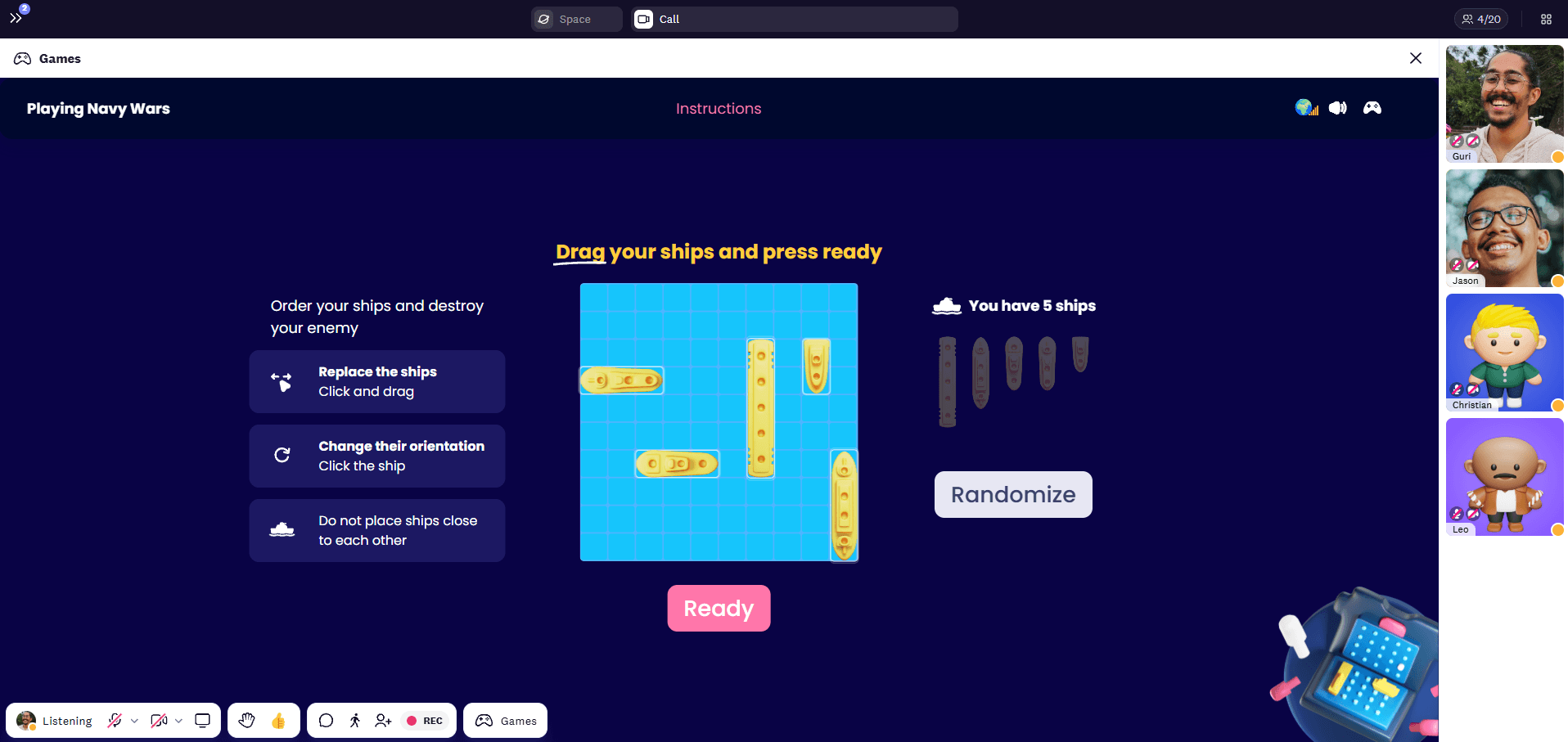 1. Place the 5 ships across the grid with some spacing. Strategise their placement so that they are hard to guess. You can even randomise their placement and change the orientation.