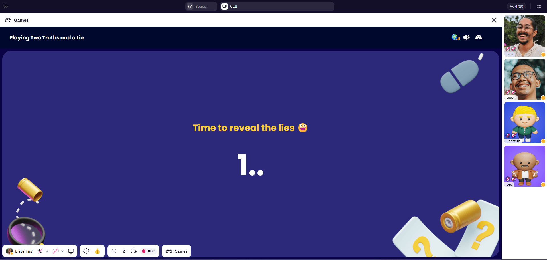 2. Everyone else will vote on what they think is a lie. Once everyone has voted, the results will be shown, and points will be given. The game continues until everyone has shared their truths and lies.